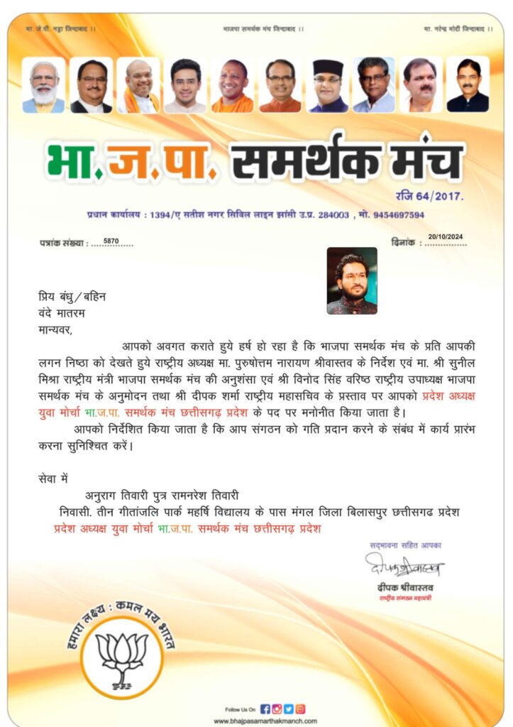 भाजपा समर्थक मंच के प्रति लगन निष्ठा व समाज सेवा में सदैव तत्पर व हर सुख दुख में सभी के मदद करने के लिए सदैव आगे रहने वाले अनुराग तिवारी जी को भाजपा समर्थक मंच के राष्ट्रीय अध्यक्ष श्रीमान पुरुषोत्तम नारायण जी के निर्देश व सुनील मिश्रा जी राष्ट्रीय संगठन मंत्री एवं दीपक शर्मा जी राष्ट्रीय महासचिव जी के प्रस्ताव पर छत्तीसगढ़ प्रदेश का युवा मोर्चा प्रदेश अध्यक्ष पद का दायित्व दिया गया है यह खबर सुनते ही उनके समर्थकों में खुशी की लहर दौड़ गई और सभी ने भरपूर स्वागत वंदन अभिनंदन व बधाइयां दी