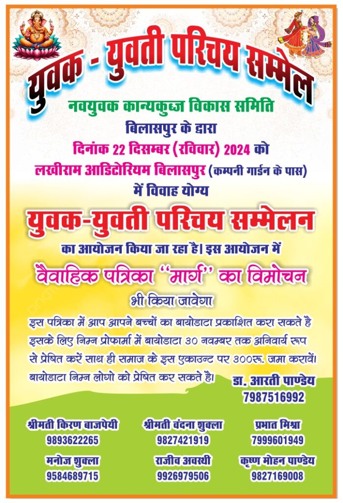 इसी प्रकार 22 दिसम्बर रविवार को लखीराम आडिटोरियम में विवाह योग्य युवक युवती सम्मेलन का आयोजन किया जावेगा इस अवसर पर वैवाहिक विशेषांक के रूप में मार्ग पत्रिका का विमोचन भी अतिथियों के कर कमलों से किया जावेगा युवक युवती का बायोडेटा रंगीन फोटो के साथ 300 शुल्क के साथ डा आरती पान्डेय मो नं