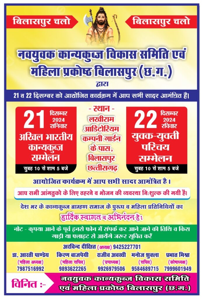 21 व 22 दिसम्बर को देश भर के कान्यकुब्ज ब्राम्हण बिलासपुर में जुटेंगे