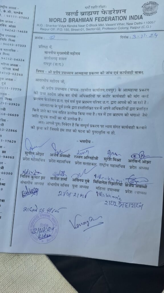 स्वर्गीय प्रदीप उपाध्याय जाँच की मांग के लिए वर्ल्ड ब्राह्मण फेडरेशन प्रतिनिधिमण्डल द्वारा ज्ञापन,पुत्र की अनुकम्पा नियुक्ति केबिनेट में प्रस्तावित करने सम्भावना क्योंकि आत्महत्या प्रकरण कानूनी प्रक्रिया।आज सुबह 11 बजे वर्ल्ड ब्राह्मण फेडरेशन के बैनर तले वर्ल्ड ब्राह्मण फेडरेशन के प्रदेश अध्यक्ष अरविन्द ओझा एवं कान्यकुब्ज ब्राह्मण समाज के सचिव सुरेश मिश्रा के नेतृत्व में एक प्रतिनिधि मंडल राज्यपाल को ज्ञापन सौंपा ज्ञापन सौंपने वालों में वर्ल्ड ब्राह्मण फेडरेशन के कार्यकर्ताओं के अतिरिक्त कान्यकुब्ज ब्राह्मण समाज से सर्वप्रथम सचिव श्री सुरेश मिश्रा संजय अवस्थी पूर्व सचिव रंजन अग्निहोत्री सहसचिव एवं कार्यकारिणी सदस्य अजय किरण अवस्थी आजीवन सदस्य बी के शुक्ला पप्पू भाई आदि उपस्थित थे