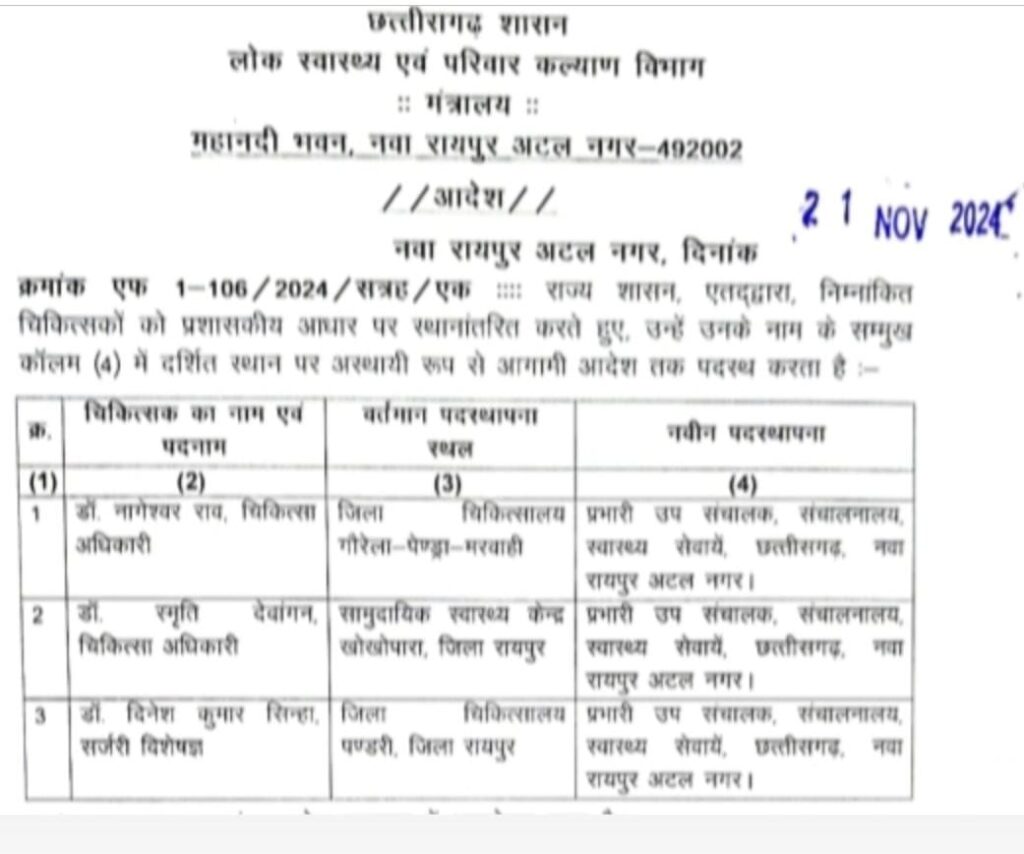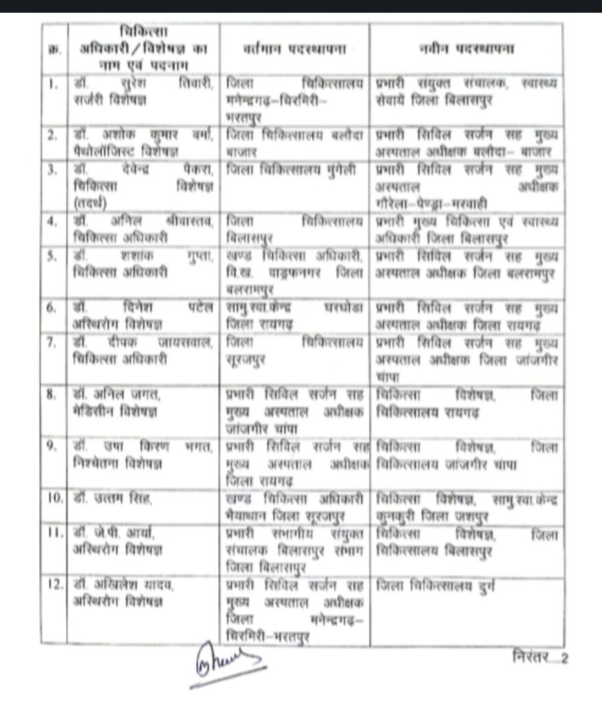 स्वस्थ विभाग के अधिकारियों का हुआ तबादला एक बार फिर से बिलासपुर का सीएमओ डॉक्टर अनिल श्रीवास्तव बनाये गए