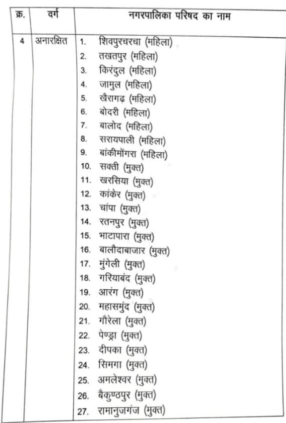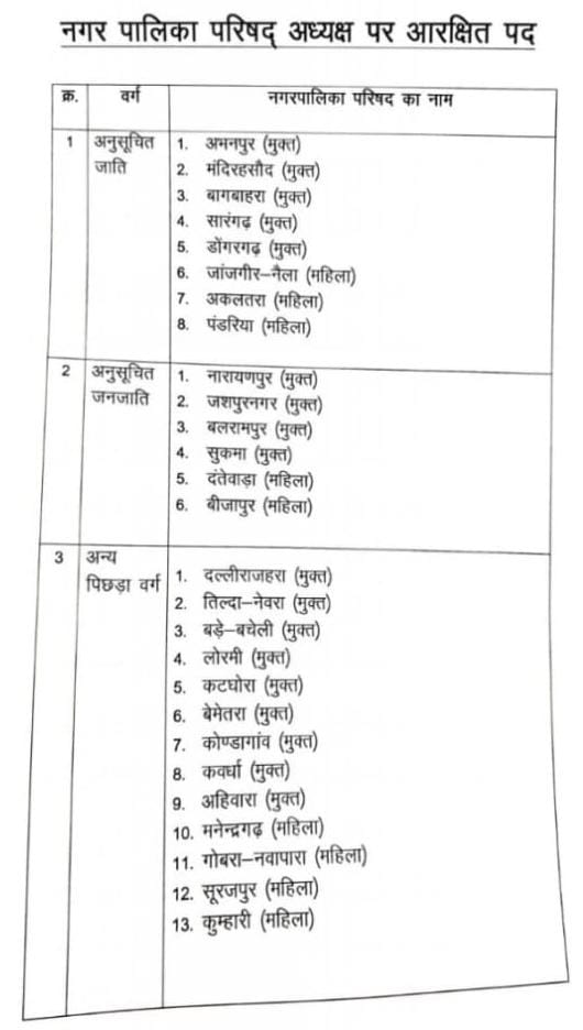 रायपुर। सभी 27 नगर पालिका के अध्यक्ष के पदों को लेकर आरक्षण की प्रक्रिया पूर्ण । देख लिस्ट
