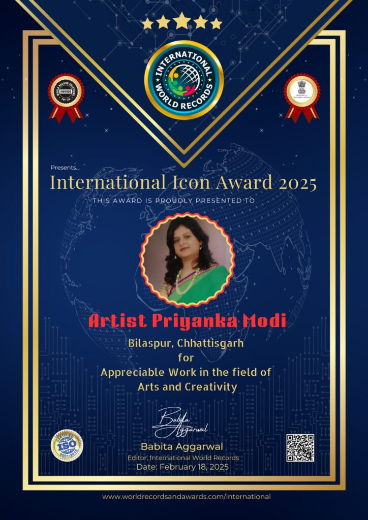 इंटरनेशनल वर्ल्ड रिकॉर्ड्स ने कला और रचनात्मक के क्षेत्र में उल्लेखनीय योगदान के लिए बिलासपुर छत्तीसगढ़ की कलाकार प्रियंका मोदी को अंतरराष्ट्रीय आइकान अवार्ड 2025 से सम्मानित किया है।