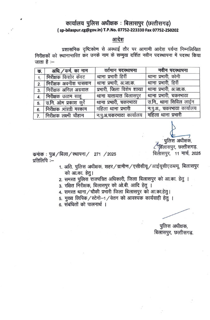 कप्तान ने किया कई थानों का तबादला किशोर केवट होंगे कोनी के थाना प्रभारी देखे ओर अन्य की लिस्ट