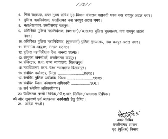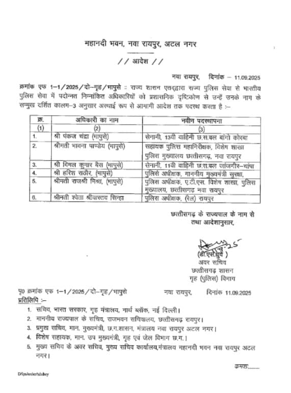 छत्तीसगढ़ गृह पुलिस विभाग द्वारा आईपीएस अधिकारियों की पद स्थापना आदेश जारी की गई देखिए आदेश की कॉपी