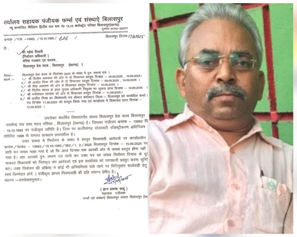 बिलासपुर। बिलासपुर प्रेस क्लब के निर्वाचन 2025 को लेकर चुनाव अधिकारी महेश तिवारी पर गंभीर लापरवाही के आरोप लगे हैं। सहायक पंजीयक, फर्म्स एवं संस्थाएं बिलासपुर ने जारी पत्र में स्पष्ट किया है कि निर्वाचन संबंधी मामले में प्रस्तुत शिकायतों पर चुनाव अधिकारी की ओर से समय-सीमा में जवाब नहीं दिया गया।