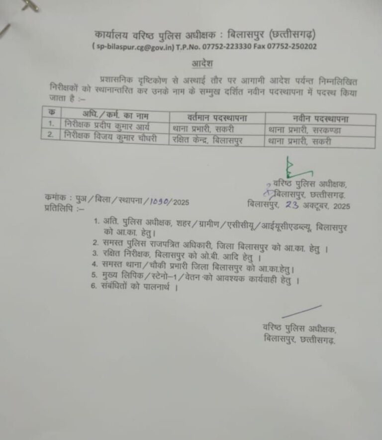 बिलासपुर, जिले में कानून व्यवस्था मजबूत बनाने के लिए और थाना प्रभारियों की कार्यकुशलता लगातार वृद्धि हो इसके लिए वरिष्ठ पुलिस अधीक्षक रजनेश सिंह ने गुरुवार को एक बार फिर महत्वपूर्ण तबादले किए हैं! 23 अक्टूबर को जारी आदेश के मुताबिक सकरी थाना प्रभारी निरीक्षक प्रदीप आर्य को अब सरकंडा थाना प्रभारी की जिम्मेदारी सौंपी गई है!
