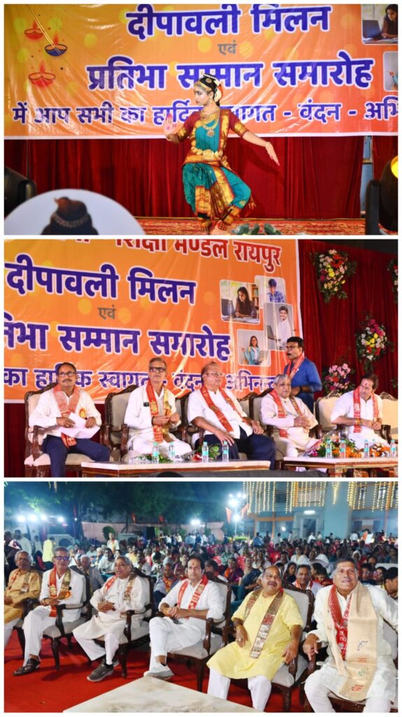रायपुर, कान्यकुब्ज ब्राह्मण समाज द्वारा दिनांक 26 अक्टूबर दिन रविवार को आशीर्वाद भवन बैरन बाजार में भव्य दीपावली मिलन समारोह एवं प्रतिभा सम्मान समारोह बड़े ही हर्षोल्लास के साथ संपन्न हुआ। इस शुभ अवसर पर बड़ी संख्या में गणमान्य अतिथि, समाज के वरिष्ठजन, महिलाएं, बच्चे तथा युवा जन उपस्थित रहे। पूरा वातावरण दीपावली के उत्सव की तरह रोशनी, खुशी और आपसी सौहार्द से भरा हुआ था। विभिन्न कक्षाओं में मेरिट में आने वाले 70 विद्यार्थियों गोल्ड एवं सिल्वर मेडल देकर सम्मानित किया गया,