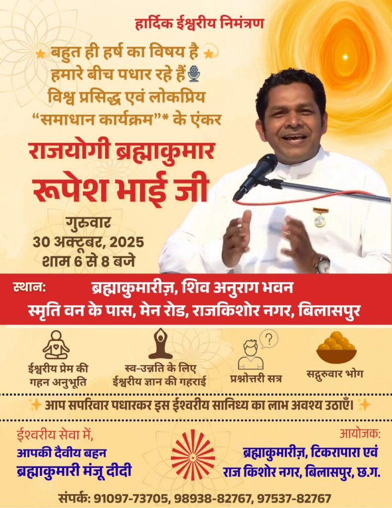 बिलासपुर। ब्रह्माकुमारीज़ राजकिशोर नगर सेवा केंद्र में गुरुवार, 30 अक्टूबर 2025 को स्व उन्नति एवं गहन योग अनुभूति” पर एक विशेष सत्र का आयोजन किया जा रहा है। इस अवसर पर ब्रह्माकुमारीज़ मुख्यालय, माउंट आबू से विश्व प्रसिद्ध एवं लोकप्रिय कार्यक्रम “समाधान” के एंकर — राजयोगी ब्रह्मा कुमार रूपेश भाई का आगमन हो रहा है।