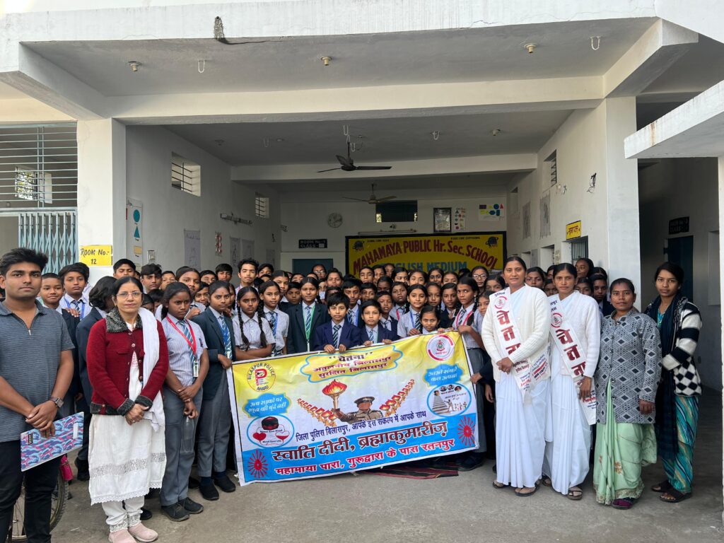 12 जनवरी 2026 रतनपुर। सड़क सुरक्षा माह के अंतर्गत रतनपुर स्थित महामाया पब्लिक हायर सेकेंडरी विद्यालय में ब्रह्माकुमारीज़ ईश्वरीय विश्वविद्यालय रतनपुर द्वारा विद्यार्थियों के लिए एक प्रभावशाली सड़क सुरक्षा जागरूकता कार्यक्रम का आयोजन किया गया। इस कार्यक्रम का उद्देश्य बच्चों एवं युवाओं में सड़क सुरक्षा नियमों के प्रति जागरूकता बढ़ाना तथा सुरक्षित, जिम्मेदार और अनुशासित यातायात व्यवहार को प्रोत्साहित करना रहा।