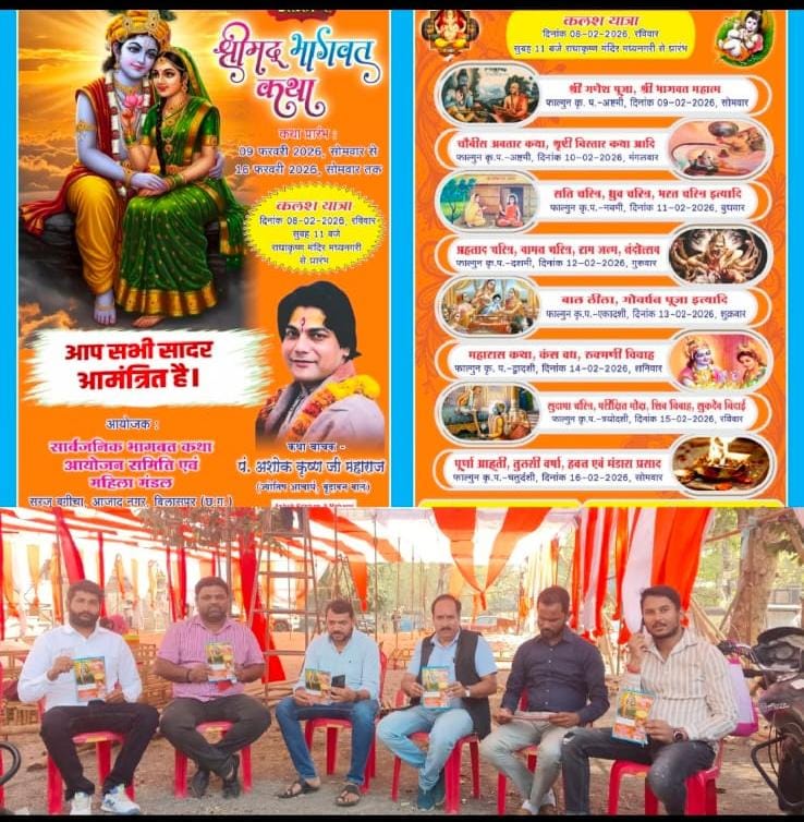 नगरसमाचार,एस.पी.शुक्ला कार्यकारी संपादक की कलम से, बिलासपुर स्थित सरजू बगीचा मसानगंज मोहल्ले में दिनांक 9 फरवरी से 16 फरवरी तक आयोजित श्रीमद् भागवत कथा की तैयारियां जोरों से चल रही है जिसमें आयोजन समिति एवं महिला मंडल कार्यकर्ता इसे सफल बनाने में जुटे हुए हैं।