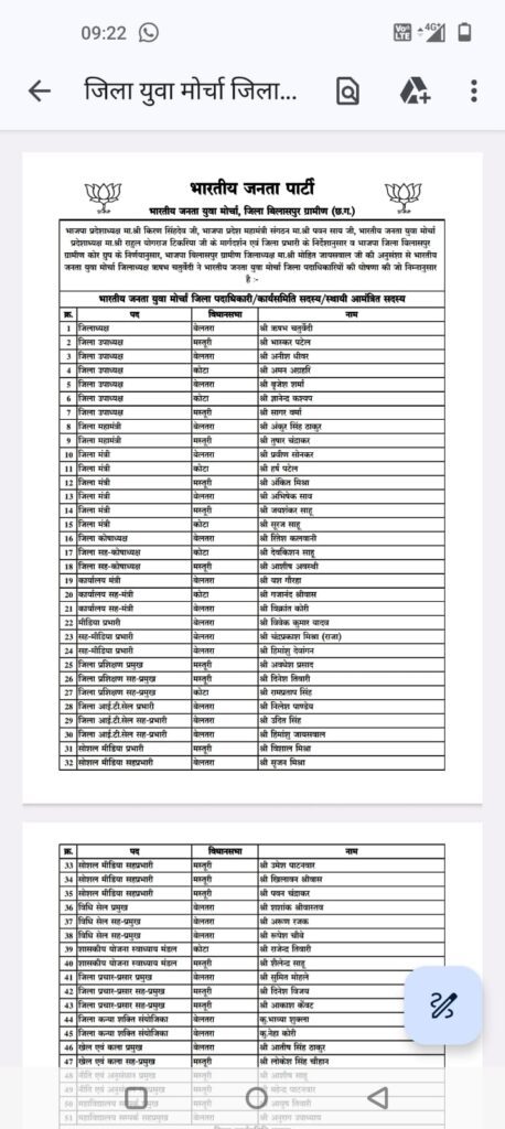 बिलासपुर।भारतीय जनता पार्टी जिला ग्रामीण संगठन ने युवामोर्चा के जिला इकाई एवं मण्डल अध्यक्षों व महामंत्रीयों की विधिवत घोषणा की है भाजपा जिला अध्यक्ष ग्रामीण के अनुमोदन पश्चात युवामोर्चा जिलाध्यक्ष ने जिला पदाधिकारियों,कार्यसमिति सदस्यों व विभिन्न मण्डलों के अध्यक्ष व महामंत्री पद के नामों की सूची जारी कर दी है।