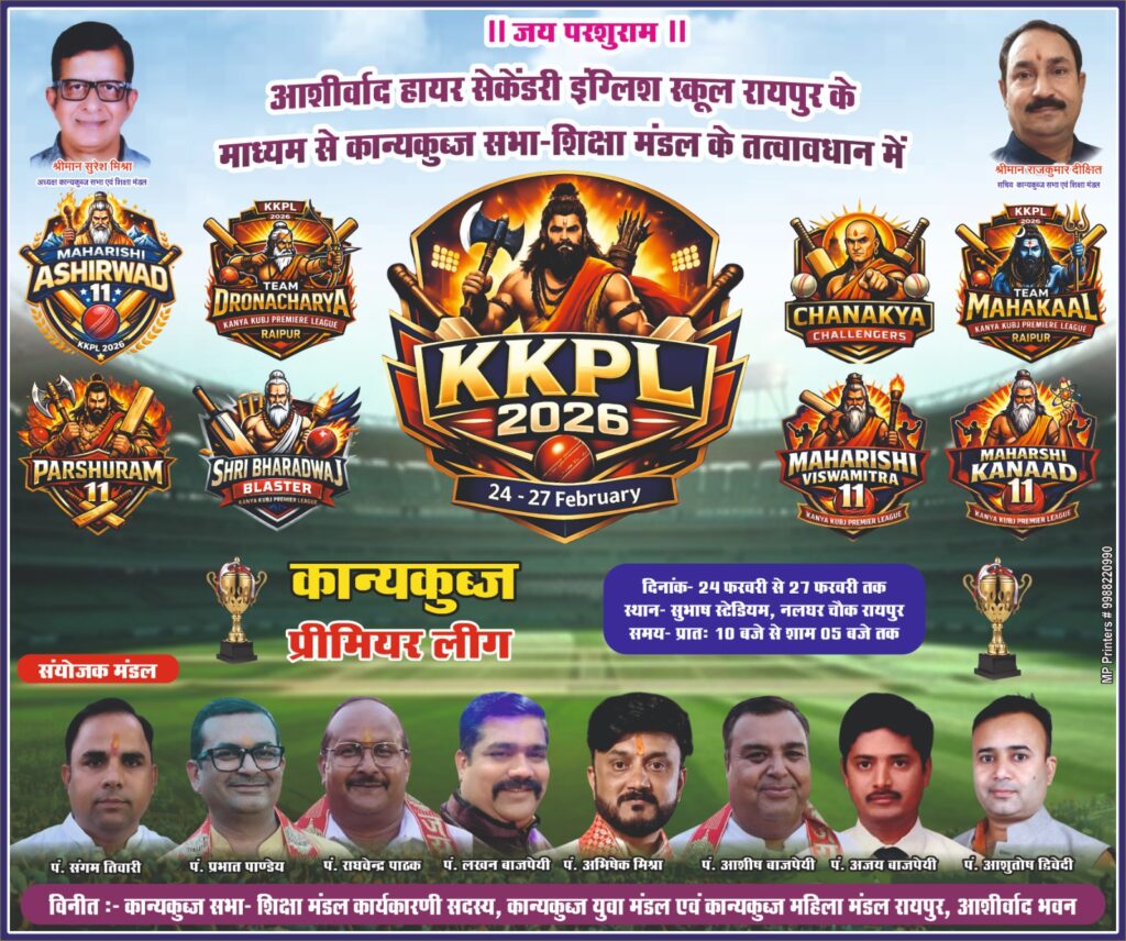 रायपुर। आशीर्वाद हायर सेकेंडरी इंग्लिश स्कूल, बैरन बाजार, रायपुर के माध्यम से कान्यकुब्ज सभा-शिक्षा मंडल के तत्वावधान में कान्यकुब्ज युवा मंडल द्वारा प्रदेश स्तरीय ‘‘कान्यकुब्ज प्रीमियर लीग-2026’’ का भव्य शुभारंभ कल दिनांक 24 फरवरी से 27 फरवरी तक, सुभाष स्टेडियम, नल घर चौक, रायपुर में किया जा रहा है। इस प्रतियोगिता में प्रदेश भर की टीम उतर रही है, जिसमें आशीर्वाद इलेवन रायपुर, द्रोणाचार्य इलेवन रायपुर, परशुराम इलेवन रायपुर, श्री भारद्वाज बस्तर, चाणक्य चैलेंजर्स, महाकाल लवन, महर्षि विश्वामित्र इलेवन बिलासपुर, महर्षि कणाद राजनांदगांव। इसका भव्य शुभारंभ मैच कल 24 फरवरी को 10ः30 बजे से आशीर्वाद इलेवन वर्सेस महर्षि विश्वामित्र एवं दी महाकाल लवन वर्सेस महर्षि कणाद इलेवन राजनांदगांव के मध्य समाज के अध्यक्ष श्री सुरेश मिश्रा, सचिव श्री राज कुमार दीक्षित, सरंक्षक श्री वीरेन्द्र पाण्डेय जी पूर्व विधायक एवं पदाधिकारियों के करकमलों से किया जाएगा। इस परिप्रेक्ष्य में महर्षि आशीर्वाद इलेवन, द्रोणाचार्य इलेवन एवं चाणक्य चैलेंजर्स टीम की जर्सी लांच समाज के अध्यक्ष सुरेश मिश्रा एवं सचिव राजकुमार दीक्षित एवं सरंक्षक वीरेन्द्र पाण्डेय द्वारा की गई। इस प्रीमियर लीग के संयोजक संगम तिवारी, प्रभात पाण्डेय, राघवेन्द्र पाठक, लखन लाल बाजपेयी, अभिषेक मिश्रा, आशीष बाजपेयी, अजय बाजपेयी, आशुतोष द्विवेदी कान्यकुब्ज युवा मंडल है।