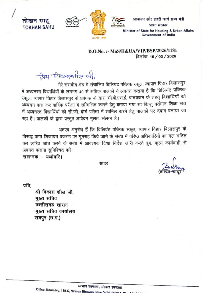 बिलासपुर। अपने संसदीय क्षेत्र में शिक्षा से जुड़े एक गंभीर प्रकरण पर केन्द्रीय आवासन एवं शहरी कार्य राज्य मंत्री तोखन साहू ने कड़ा रुख अपनाया है। ब्रिलियंट पब्लिक स्कूल, व्यापार विहार में विद्यार्थियों और पालकों किए गए गुमराह करने के मामले को उन्होंने बेहद गंभीरता से लेते हुए छत्तीसगढ़ शासन के मुख्य सचिव विकास शील से सीधे चर्चा की और तत्काल कार्रवाई के लिए औपचारिक पत्र भी प्रेषित किया।