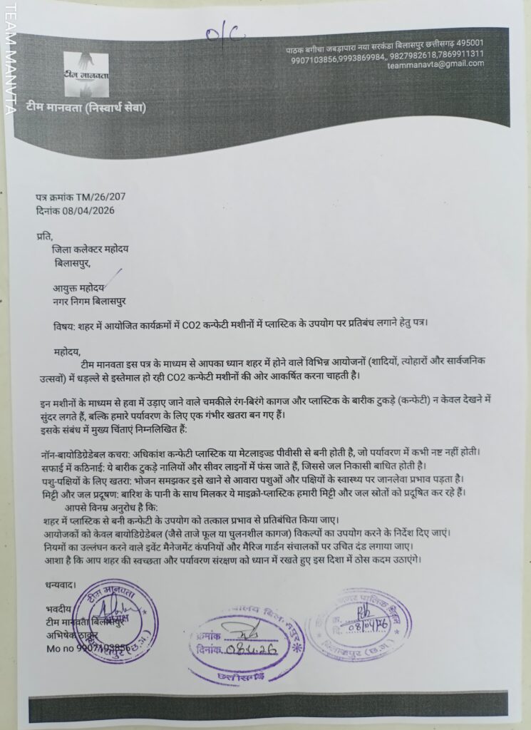 ​शहर की प्रमुख समाजसेवी संस्था ‘टीम मानवता’ ने बिलासपुर में आयोजित होने वाली शादियों और सार्वजनिक उत्सवों में बढ़ते प्रदूषण पर चिंता व्यक्त करते हुए जिला कलेक्टर,नगर निगम प्रशासन से सख्त कदम उठाने की मांग की है। संस्था के प्रतिनिधिमंडल ने आज जिला कलेक्टर और नगर निगम आयुक्त को पत्र सौंपकर CO2 कन्फेटी मशीनों में इस्तेमाल होने वाले प्लास्टिक और मेटलाइज्ड पीवीसी के बारीक टुकड़ों पर तत्काल प्रतिबंध लगाने का आग्रह किया। जो