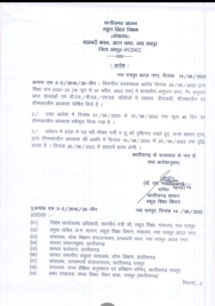 छत्तीसगढ़ में सभी सरकारी और निजी स्कूलों को 26 जून 2023 तक बंद रखने के निर्देश प्रदेश के मुख्यमंत्री भूपेश बघेल ने दिए हैं। सीएम के इस आदेश की वजह भीषण गर्मी को बताई गई है। प्रदेश के स्कूलों में गर्मी की छुट्टियों का ऐलान 15 जून तक के लिए किया गया था लेकिन इस वक्त कई जिलों में गर्म हवाएं चल रही है और लू के हालात हैं। प्रदेश में मानसून अभी दूर है आगे कहना सही नही होगा कि बरसात कब होगी फिलहाल बच्चों को थोड़ी राहत जरूर मिलेगी
