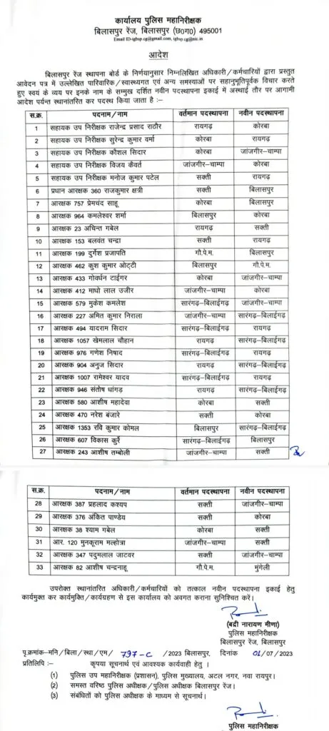 बिलासपुर रेंज में 33 पुलिसकर्मियों का तबादला देखे आदेश