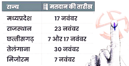 रायपुर। छत्तीसगढ़ के साथ पांच राज्यों में विधान सभा चुनाव की घोषणा कर दी गई हो गयी इसके साथ ही छत्तीसगढ़ में 7 और 17 नवंबर को वोटिंग होगी। 3 दिसंबर को सभी राज्यों के चुनाव परिणाम घोषित हो जाएंगे। चुनाव की तारीखों की घोषणा के साथ ही सभी प्रदेशों में आचार संहिता लागू हो कर दी गयी है। अब देखना ये होगा कि जनता क्या फैसला देती है ओर किसकी सरकार छत्तीसगढ़ में बनती है