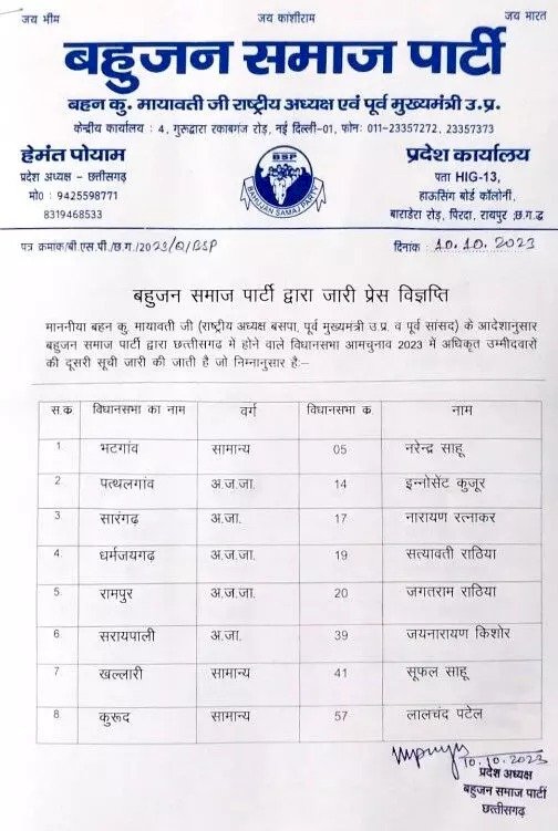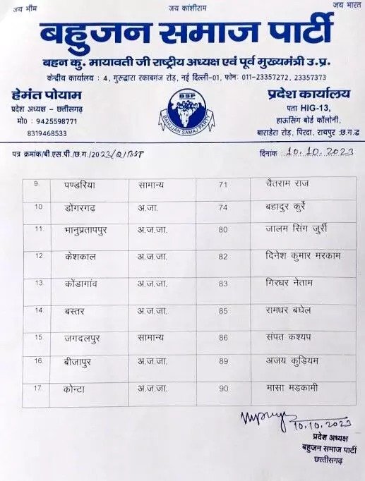छत्तीसगढ़ में बसपा पार्टी ने अपनी प्रत्याशियों की दूसरी सूची जारी की