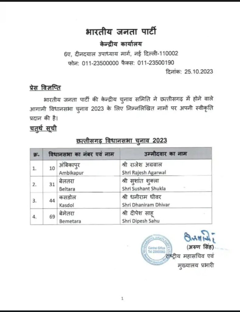 भाजपा ने बचे हुए अपनी 4 सीटों के प्रत्याशियों के नामों का किया ऐलान, बेलतरा से सुशांत शुक्ला को मिली टिकट
