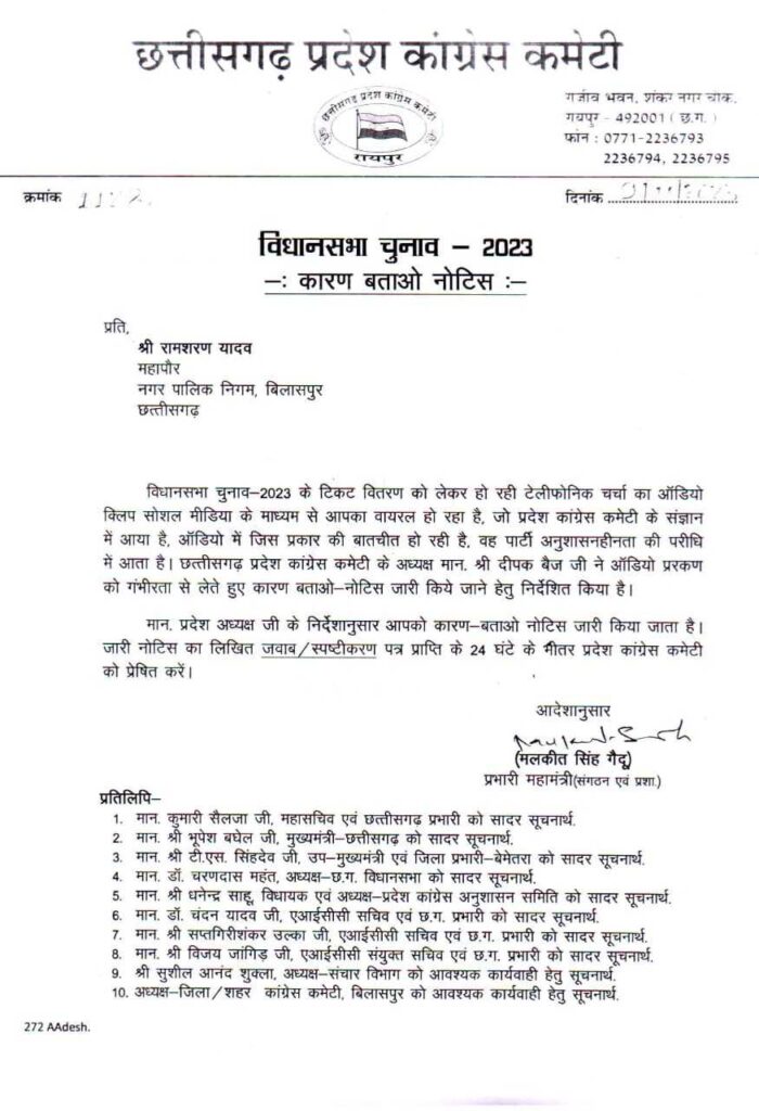 रायपुर. प्रदेश कांग्रेस कमेटी ने बिलासपुर महापौर रामशरण यादव को नोटिस भेजकर 24 घंटे के अंदर जवाब मांगा है. आप को बता दे कि सोशल मीडिया में पूर्व विधायक अरुण तिवारी और महापौर के बीच बातचीत का ऑडियो वायरल हुआ था. इस ऑडियों में जो बातचीत हुई है वह पार्टी की अनुशासहीनता माना जा रहा है निकट चुनाव भी है इस तरह से बात करना अनुशासन हीन है।