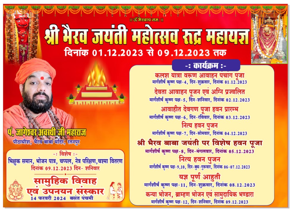 रतनपुर :: भैरव बाबा मंदिर में नौ दिवसीय जयंती पर रुद्र महायज्ञ का आयोजन 1 दिसंबर से किया जा रहा है समापन 9 दिसंबर को होगा मंदिर में महोत्सव की तैयारियां जोरों से चल रही है इस संबंध में भैरव बाबा मंदिर के पीठाधीश पंडित जागेश्वर अवस्थी ने बताया की भैरव बाबा मंदिर में जयंती महोत्सव रुद्र महायज्ञ एक दिसंबर से शुरू होगा प्रथम दिन कलश यात्रा वरुण देवता आवाहन पंचांग पूजा किया जाएगा इसके बाद दूसरे दिन देवता आवाहन पूजन एवं अग्नि प्रचलित किया जाएगा और उसके बाद तीसरे दिन आवाहित देवगण की पूजा हवन प्रारंभ 3 दिसंबर से होगा उसके बाद नित्य हवन पूजन किया जाएगा 4 दिसंबर को भैरव बाबा जयंती पर विशेष हवन पूजा किया जाएगा नित्य हवन पूजन किया जाएगा यज्ञ पूर्ण आहुति 8 दिसंबर को किया जाएगा कन्या भोजन ब्राह्मण भोजन एवं सामूहिक भंडारा नौ दिसंबर को किया जाएगा।
