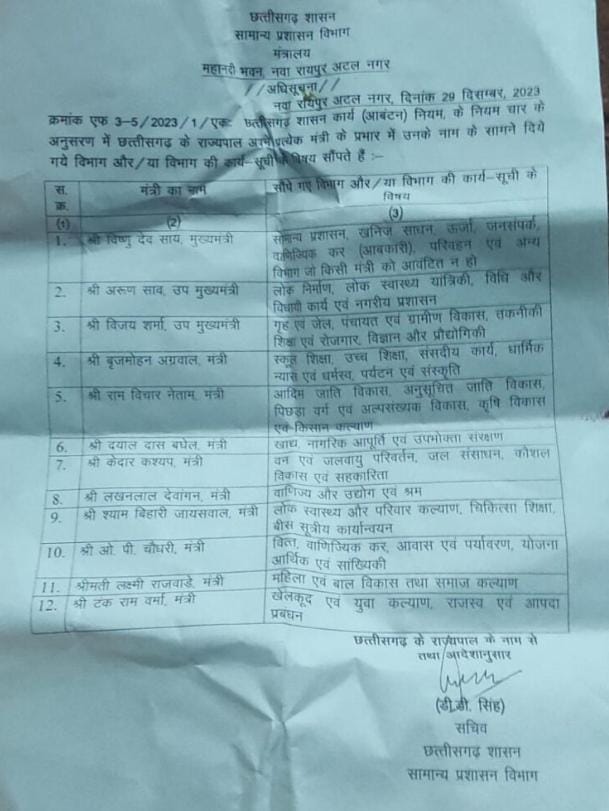 छत्तीसगढ़ में मंत्रियों के विभागों का हुआ बटवारा देखिए किसको क्या मिला जवाबदारी
