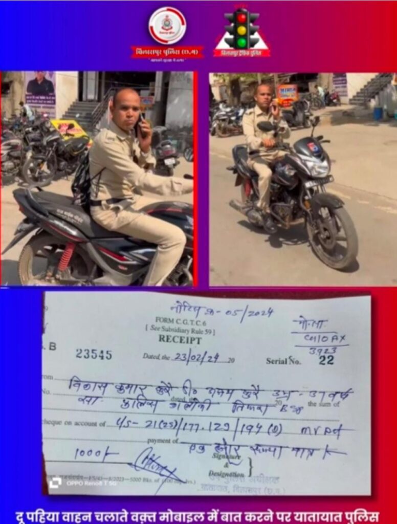 यातायात पुलिस बिलासपुर द्वारा पुलिस आरक्षक का काटा 1000/- का चालान गाड़ी चलाते बात करते भी दिखे आरक्षक