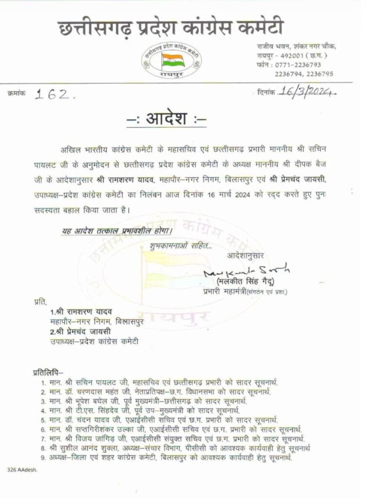 महापौर रामशरण यादव का निष्कासन हुआ रद्द पूर्व विधायक और प्रदेश कांग्रेस कमेटी के उपाध्यक्ष का भी निष्कासन किया गया रद्द