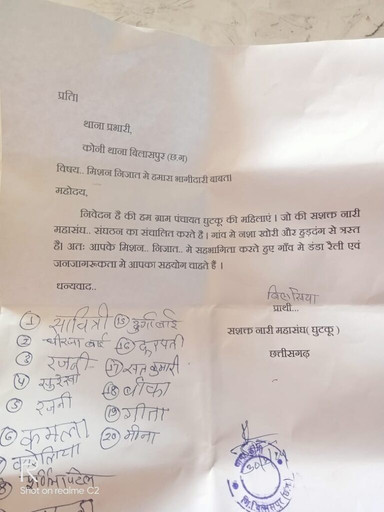 निजात मिशन में भागीदारी का निर्णय, नारी सशक्त महासंघ संगठन घुटकू की महिलाओं ने मिशन निजात अभियान के तहत गांवों में हो रही नशाखोरी के खिलाफ पुलिस प्रशासन के सहयोग से अभियान चलाने का निर्णय सर्वसम्मति से लिया है,इसके लिए आज संगठन की महिलाओं ने कोनी थाने में इस आशय का आवेदन पत्र भी दिया है जिसमें गांवों में घूम घूमकर नशाखोरी पर अंकुश लगाने की बात लिखी गई है।नारी सशक्त महासंघ संगठन की महिलाओं ने डंडा रैली निकाल कर सहभागिता की जरुरतों पर बल दिया है,उनके ऐसे कार्यों के संचालन से गांव में निःसंदेह नशाखोरी एवं शराब की अवैध बिक्री पर प्रतिबंध जरुर लगेगी,आज के इस ज्ञापन देने वालों में इसकी अध्यक्ष बिलसिया पटेल सहित संगठन की सभी कार्यकर्ताओं की उपस्थिति रही।