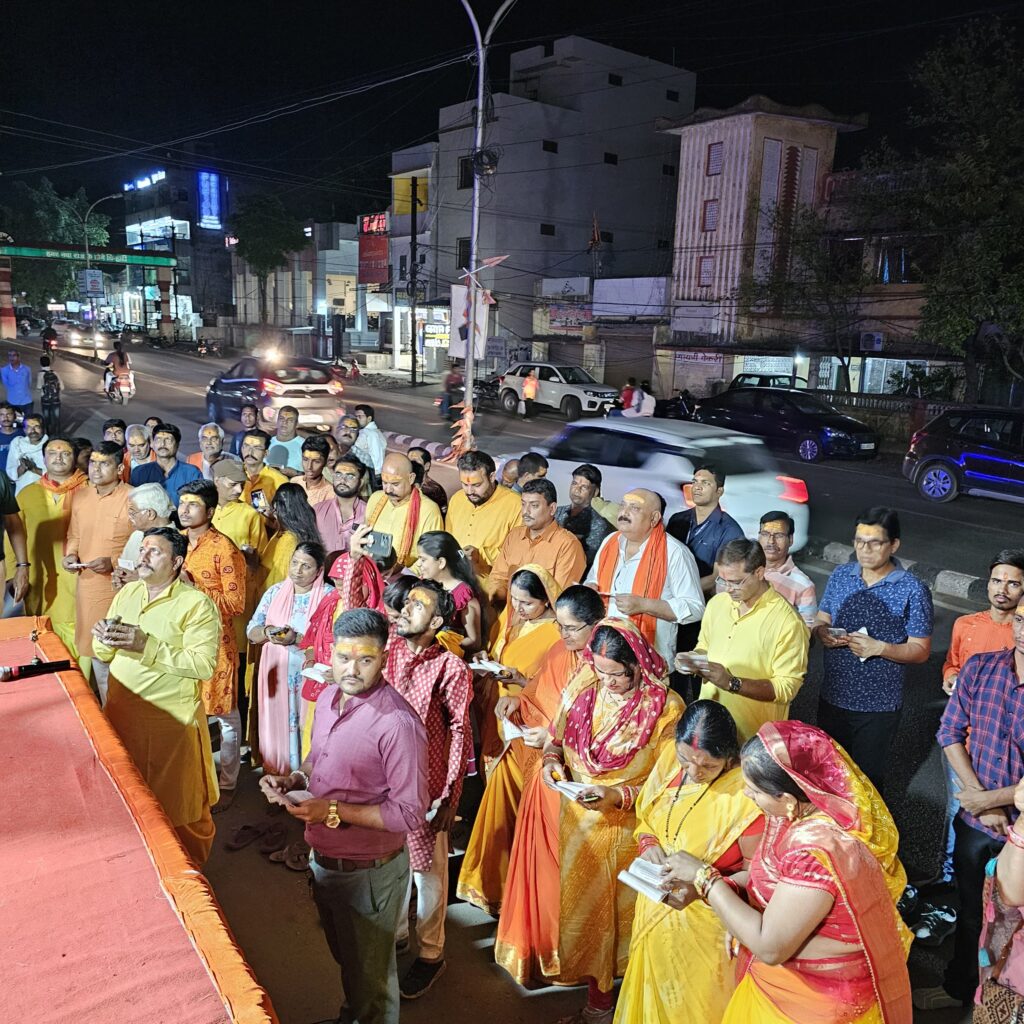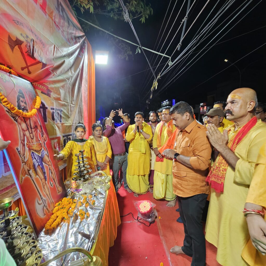 ब्राह्मण युवा आयाम छ.ग द्वारा भगवान श्री परशुराम जी की महाआरती एवं भंडारा कार्यक्रम भगवान श्री परशुराम जन्मोत्सव के पावन अवसर पर श्यामा टेंट हाउस के सामने सरकण्डा मुख्य मार्ग में आयोजित किया गया ब्राह्मण युवा आयाम के संस्थापक एवं अध्यक्ष ज्योतिन्द्र उपाध्याय ने बताया कि भगवान श्री परशुराम जी के जन्मोत्सव के पावन अवसर पर विद्वान पुरोहितों द्वारा 51- दियो के 3 सेटो में भव्य महाआरती गंगा आरती की तर्ज पर किया गया इसके पश्यात भव्य भंडारा का आयोजन किया गया जिसमे मुख्य अतिथि बेलतरा विधायक श्री सुशांत शुक्ला जी द्वारा पूजा पाठ आरती की गई और भंडारा प्रसाद वितरण में सेवाकार्य भी किये इस विशाल महाआरती में भारी संख्या में विप्रजन उपस्थित हुए और महाआरती के साक्षी बने भगवान श्री परशुराम जन्मोत्सव आयोजन समिति बिलासपुर संग ब्राह्मण युवा आयाम द्वारा आयोजित महाआरती में मुख्य रूप डॉ प्रदीप शुक्ला, संस्थापक एवं अध्यक्ष ब्राह्मण युवा आयाम ज्योतिन्द्र उपाध्याय, अनिल तिवारी, डॉ प्रफुल्ल शर्मा, डॉ विवेक बाजपेई, हरीश शर्मा, रविन्द्र उपाध्याय, सत्येंद्र शर्मा, अनिल गौरहा, रतिन्द्र उपाध्याय, अंकित गौरहा जिला पंचायत सभापति, प्रशांत मिश्रा, अशोक तिवारी, विनोद शर्मा, चंद्रभूषण शुक्ला, शिवकुमार तिवारी, जग्गू शास्त्री ईश्वर तिवारी, अंचल दुबे, आयुष दुबे, कमलेश दुबे, पीयूष गौरहा,आकाश तिवारी, मानस मिश्रा, शुभम पाठक, ऋषभ शर्मा, हरिशंकर तिवारी, आशुतोष मिश्रा, हर्ष तिवारी, अभिषेक चौबे, गुड्डा मिश्रा, अंकित राज तिवारी, हेमंत शर्मा, अभिजीत बाबू पाण्डेय, दिशु दुबे, गौरव पाण्डेय, शान्तनु पाण्डेय, दीपक तिवारी, सार्थक उपाध्याय, सुयश तिवारी, अभ्युदय तिवारी, राकेश गौरहा,आदित्य मिश्रा, विकास सिंह, क्षितिज एवं महिला विंग से सश्मिता शर्मा, रजनी शुक्ला, मुक्ता उपाध्याय, रश्मि पाण्डेय, श्वेता शास्त्री, स्वाति उपाध्याय, रंजीता मिश्रा, उपासना दुबे, काव्या दुबे, भाव्या शुक्ला, रिमझिम दुबे, अल्का तिवारी, अनिता तिवारी,अंशु अंचल दुबे, किरण बाला पाण्डेय, अचला तिवारी, शशि द्विवेदी, सरिता तिवारी सहित भारी संख्या में विप्रजन उपस्थित हुए