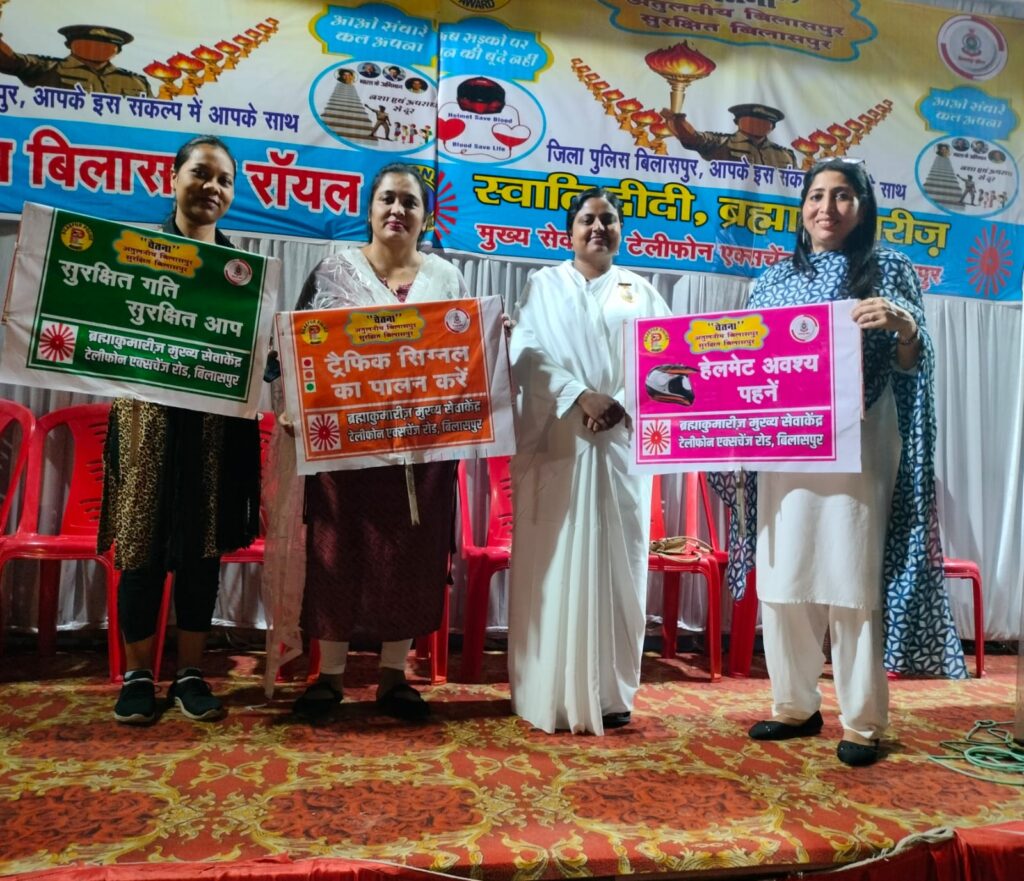 ब्रह्माकुमारीज की मुख्य शाखा टेलीफोन एक्सचेंज स्थित राजयोग भवन सेवाकेंद्र संचालिका बीके स्वाति दीदी के नेतृत्व में सत्यम टाकीज चौक में यातायात के नियमों की आने जाने वाले वाहन चालकों को जागृत करते हुए बीके संतोषी दीदी, बीके गायत्री दीदी, कायस्थ समाज के अध्यक्ष भ्राता आलोक वर्मा जी, कायस्थ समाज के पूर्व अध्यक्ष भ्राता प्रदीप खरे जी, नागरिक सुरक्षा सेवा संगठन से बहन फिरोज अलीम जी, विश्वास सोशल वेलफेयर सोसाइटी से बहन संध्या चंद्रसेन जी, एवं बहन मनीषा सैमुवेल जी, साप्ताहिक समाचार पत्र जोगी जगत के प्रधान सम्पादक भ्राता शेक अब्दुल कलीम जी, श्री पुष्पा सूर्या फाउंडेशन से गौरव शुक्ला जी एवम ब्रह्माकुमारीज के भाई बहने उपस्थित रहे।
