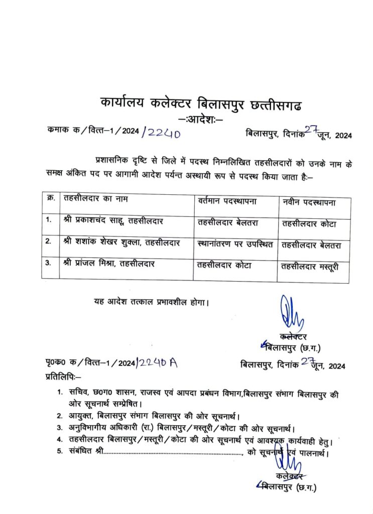 • बिग ब्रेकिंग: तहसीलदार का हुआ तबादला देखे आदेश की कॉपी