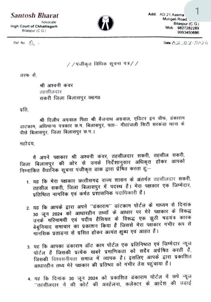 तहसीलदार सकरी ने एक करोड़ के मानहानि का दावा ठोका, तहसील सकरी में पदस्थ तहसीलदार अश्वनी कंवर के द्वारा दिनांक 30/6/2024 को डंकाराम डाटकाम में उनके विरुद्ध आधारहीन तथ्यों के आधार पर छापे गए न्यूज से क्षुब्ध होकर डंकाराम डाटकाम के एडीटर इन चीफ दिलीप अग्रवाल पिता बैजनाथ अग्रवाल निवासी गीतांजलि सिटी, सरकंडा थाने के पीछे, बिलासपुर को अपने अधिवक्ता संतोष भारत के माध्यम से एक करोड़ रुपए के मानहानि एवं एफआईआर दर्ज कराने संबंधी पंजीकृत सूचना पत्र भेजा है, उन्होंने श्री सूर्या पुष्पा पोर्टल न्यूज को इस संबंध में बताया कि जिस न्यूज का प्रकाशन किया गया है वह बेबुनियाद, आधारहीन एवं झूठा है,इस न्यूज के छपने से उनके मान सम्मान को ठेस पहुंची है, अगर उस न्यूज का खंडन उक्त न्यूज चैनल के द्वारा नहीं किया जाता है तो वे निश्चित रूप से कोर्ट जाने को बाध्य होंगे जिसकी समस्त जवाबदारी डंकाराम डाटकाम की होगी।