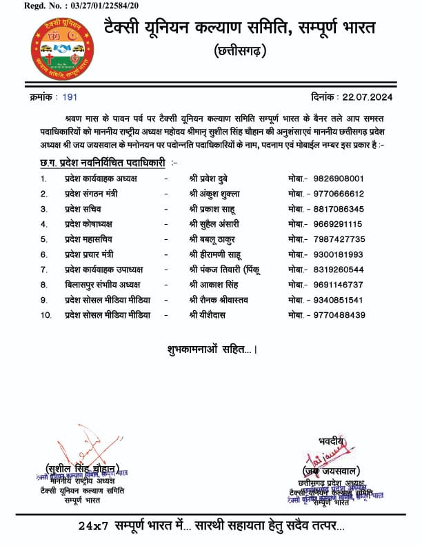 आप के द्वारा मुझ कार्यकर्ता / सदस्य पर इतना भरोसा करने व इतनी महत्वपूर्ण भूमिका में पदासीन किए जाने पर सदैव टैक्सी यूनियन परिवार का आभारी रहूंगा देखिये नियुक्ति पत्र