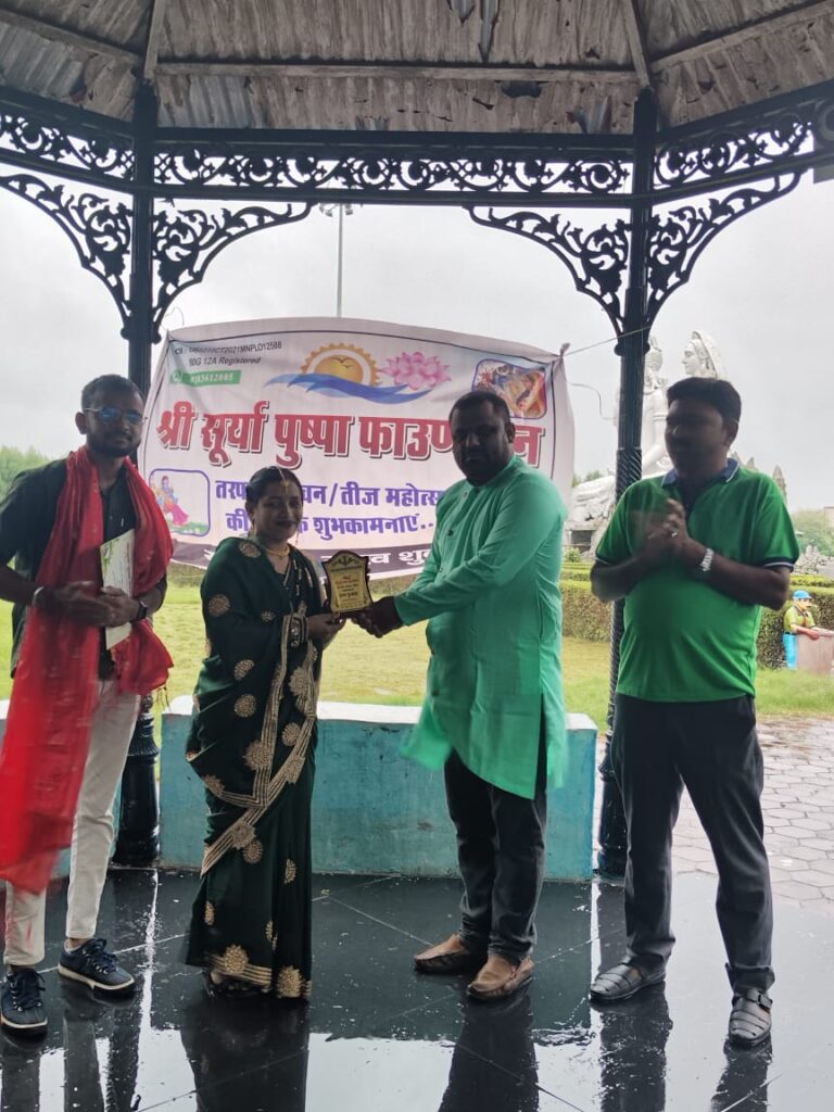 श्रीसूर्या पुष्पा फाउंडेशन हर सामाजिक कार्य करता रहता है और इसी सामाजिक कार्य में शहर में एक अलग ही पहचान है चाहे वह पेड़ लगाने के लिए ब्लड डोनेशन में वृद्ध आश्रम में सेवा बच्चों को मोबाइल से दूर करने का अभियान चेतना अभियान ऐसे बहुत से अनगिनत एक्टिविटी है जो वह करता रहता है इसी कड़ी में फाउंडेशन के द्वारा सावन महोत्सव मनाया गया जो शहरी प्रेसिडेंट आमना राजगीर और ग्रामीण प्रेसिडेंट जया साहू के सानिध्य में पूरा हुआ और जिसमें सभी महिलायो ने बढ़-चढ़ के हिस्सा लिया और उसमें मनोरंजन गेम खेले गए और गाना भी गाया गया व डांस हुआ और इन सब में प्रतियोगिता आयोजित की गई थी जिसमें विशिष्ट अतिथि फाउंडेशन के डायरेक्टर गौरव शुक्ला जी के द्वारा सभी को सर्टिफिकेट दिया गया और फर्स्ट प्राइस सेकंड प्राइस और थर्ड प्राइस वाले को मोमेंटो देकर सम्मानित किया गया तत्पश्चात कार्यक़म का समापन किया गया