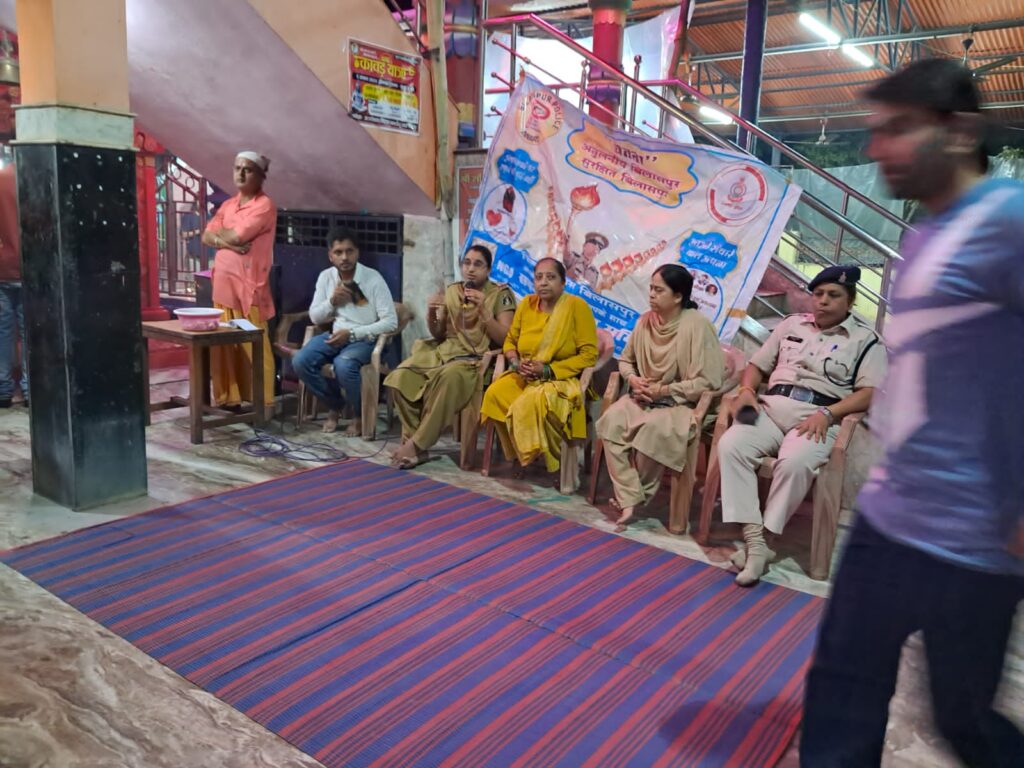 NGO सपना महिला समिति द्वारा आज दिन शनिवार को शनि मंदिर में महिला एवं बाल अपराध का कार्यक्रम रखा गया इस कार्यक्रम में महिला थाना से उपनिरीक्षक संतोषी अग्रवाल, महिला आरक्षक शिवानी सिंह, मालती तिवारी व आरक्षक दिनेश प्रधान उपस्थित थे उन्होंने महिलाओं के साथ हो रहे अपराध व बच्चों के साथ हो रहे अपराधिक गतिविधियों के बारे में जानकारी दी शनि मंदिर में उपस्थित अपार जनसमूह इस कार्यक्रम का लाभ लिया कार्यक्रम को सफल बनाने में श्री सुर्या पुष्पा फाउंडेशन ,सोमित धर, सात्विक सराफ, कुनाल केडिया,पायल सुर्यवंशी,गीता दुबे, अंजली केवट तरनजीत कुमार, जिग्यासा सराफ,सुदिप दुबे,तापस सरकार सुधा कंठ, निर्मला गुप्ता, संतोषी विश्वकर्मा, टिकेश्वर साव,आमना राजगीर, राजेश्वरी साव व मंदिर में उपस्थित अनेकों भक्त गण का भरपूर सहयोग मिला तथा मंदिर समिति ने उपस्थित सभी अधिकारियों का श्रीफल देकर सम्मानित किया तथा कहा की इस तरह के कार्यक्रम हमेशा यहां करेंगे इसकी जानकारी संगठन की अध्यक्ष सपना सराफ ने दिया